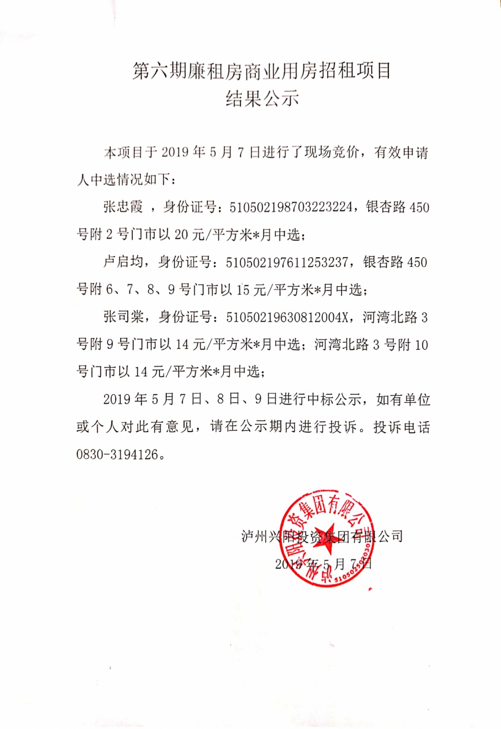 第六期廉租房商业用房招租项目结果公示