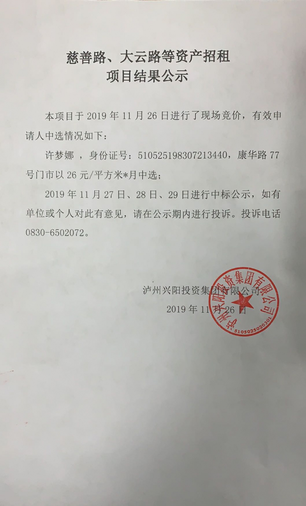 慈善路、大云路等资产招租项目结果公示