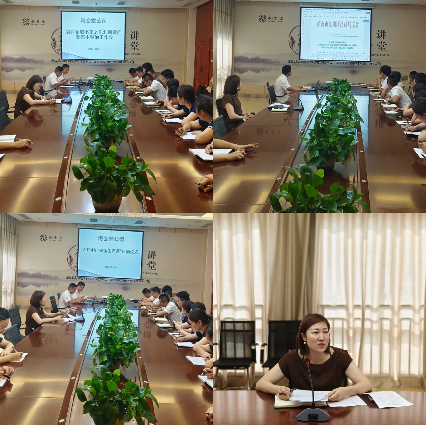 5月24日,海会堂公司召开殡葬领域不正之风和腐败问题集中整治工作推进会,组织学习了中央、省、市、区民政部门关于开展殡葬领域不正之风和腐败问题集中整治工作方案,传达了近期相关专项工作通知。海会堂站长曾燕指出,殡葬领域不正之风和腐败问题集中整治工作是近期的核心工作之一,要求全体员工以此为契机,全面规范业务流程、提升服务水准、防范廉洁风险。会上还开展了2024年“安全生产月”启动仪式。