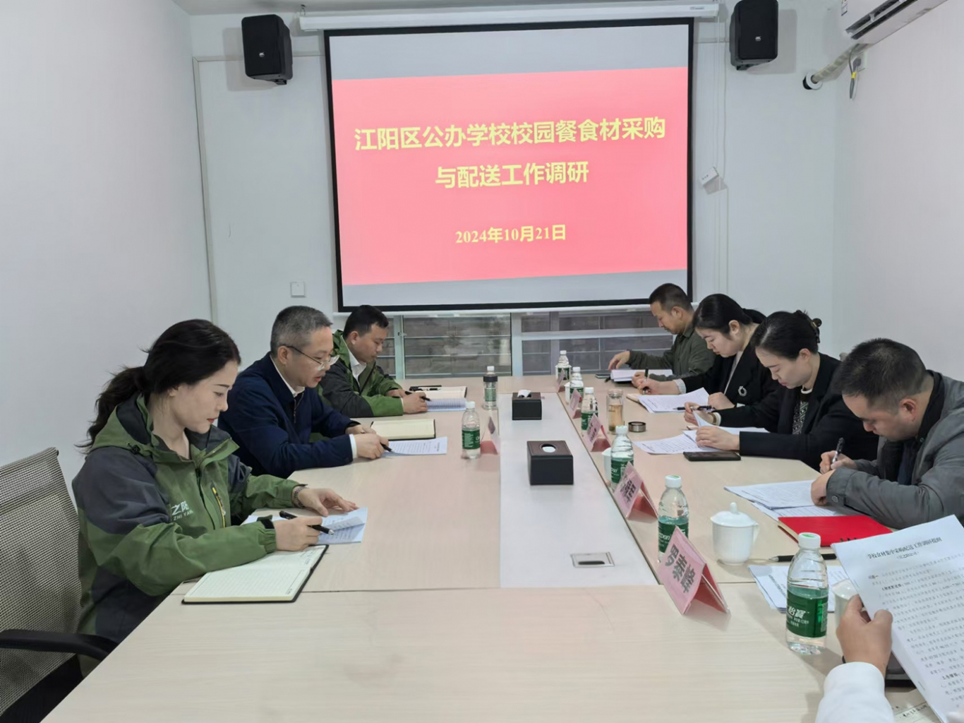 10月21日下午,江阳区副区长苏菲同志率领调研组深入江之阳公司,就江阳区公办学校校园餐食材配送工作开展专题调研。苏区长一行在实地考察配送场地后,江之阳公司董事长杜宇同志向调研组详细汇报了公司的经营管理、供应链管控、人员配置、降本增效等核心情况。参会人员针对商品集采、质量标准、食品安全、询价模式、结算周期等方面进行了深入交流与探讨。
